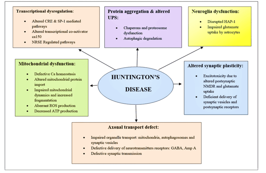 Fig 1.Schematic of diverging pathways leading to the pathogenesis of HD(doi.org/10.3390/brainsci12101389)