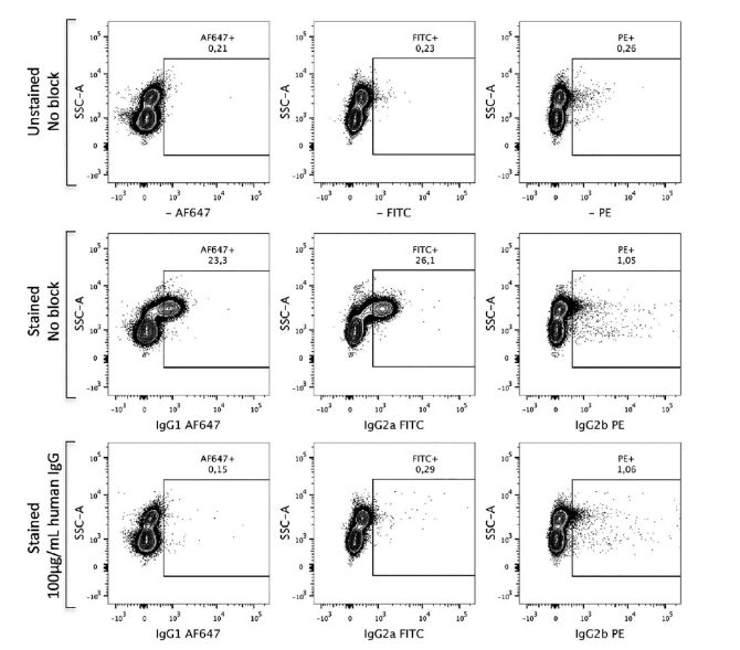 Figure 2. Staining results of CD45 under different treatments (Isotype control without Fc block, background elevated; Fc block reduces background)