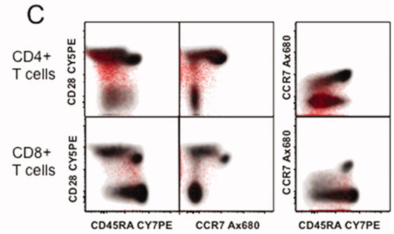 3). Naïve and memory T cell populations in both CD4+ and CD8+ subsets were assessed. Boolean gating was then used to overlay the overall cytokine response (shown in red) onto the corresponding CD4+ or CD8+ T cell lineage (shown in gray), enabling identification of activated and mature cell phenotypes.