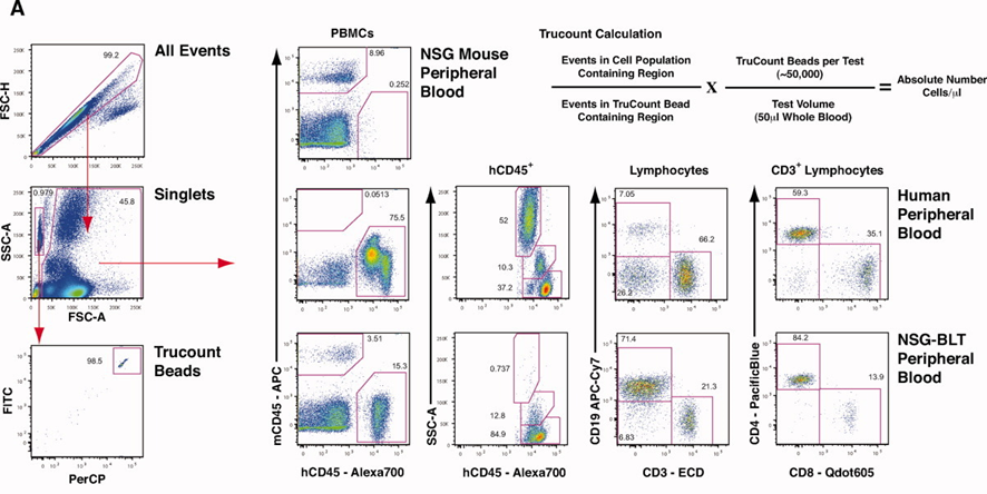 1). Lysed red blood cells, excluded cell aggregates.microbead populations and cell populations were gated separately. Absolute cell counts were calculated using bead populations; Mouse CD45/Human CD45 distinguished human and murine leukocytes (demonstrating differences among three sample types: normal NSG mice, healthy human blood, and humanized NSG-BLT mice). Human CD45, CD3, CD19, CD4, and CD8 were then used to analyze distinct cell populations in healthy human blood and humanized NSG-BLT mice.