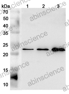 Western blot analysis was performed using anti-FGF21 polyclonal antibody at 1μg/ml on various samples. Lane 1: HepG2 cell lysate Lane 2: Raji cell lysate Lane 3: 293T cell lysate