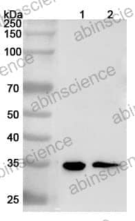 Western blot analysis was performed using anti-HMG20B polyclonal antibody at 1ug/mL on various samples. Lane 1: 293T cell lysate Lane 2: K562 cell lysate