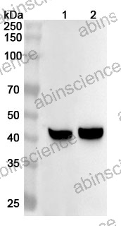 Western blot analysis was performed using anti-MAT1A polyclonal antibody at 1ug/mL on various samples. Lane 1: Mouse liver lysate Lane 2: Rat liver lysate