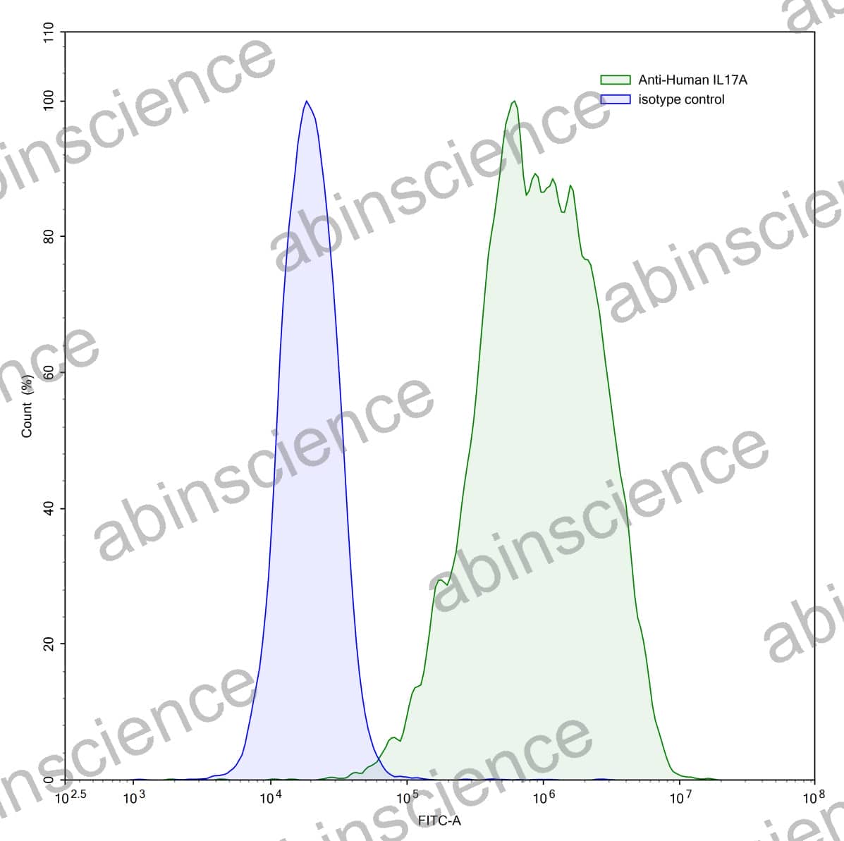 Flow-cytometry using anti-human IL17A antibody.Human Jurkat cell line were stained with an irrelevant antibody (Blue Histogram) or an anti-human IL17A antibody monoclonal antibody (Catalog # HS856010 ,Green Histogram) at a concentration of 5 µg/ml for 30 mins at RT. After washing, bound antibody was detected using a FITC conjugated goat anti-human antibody (Catalog # HF690414) and cells analysed on a NovoCyte Flow Cytometer.