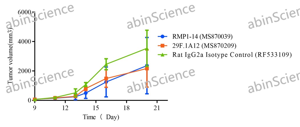 Mice treatment with RMP1-14 significantly reduced tumor growth compared with the Rat IgG2a isotype control (RF533109), as shown by lower tumor volumes during the observation period. |
