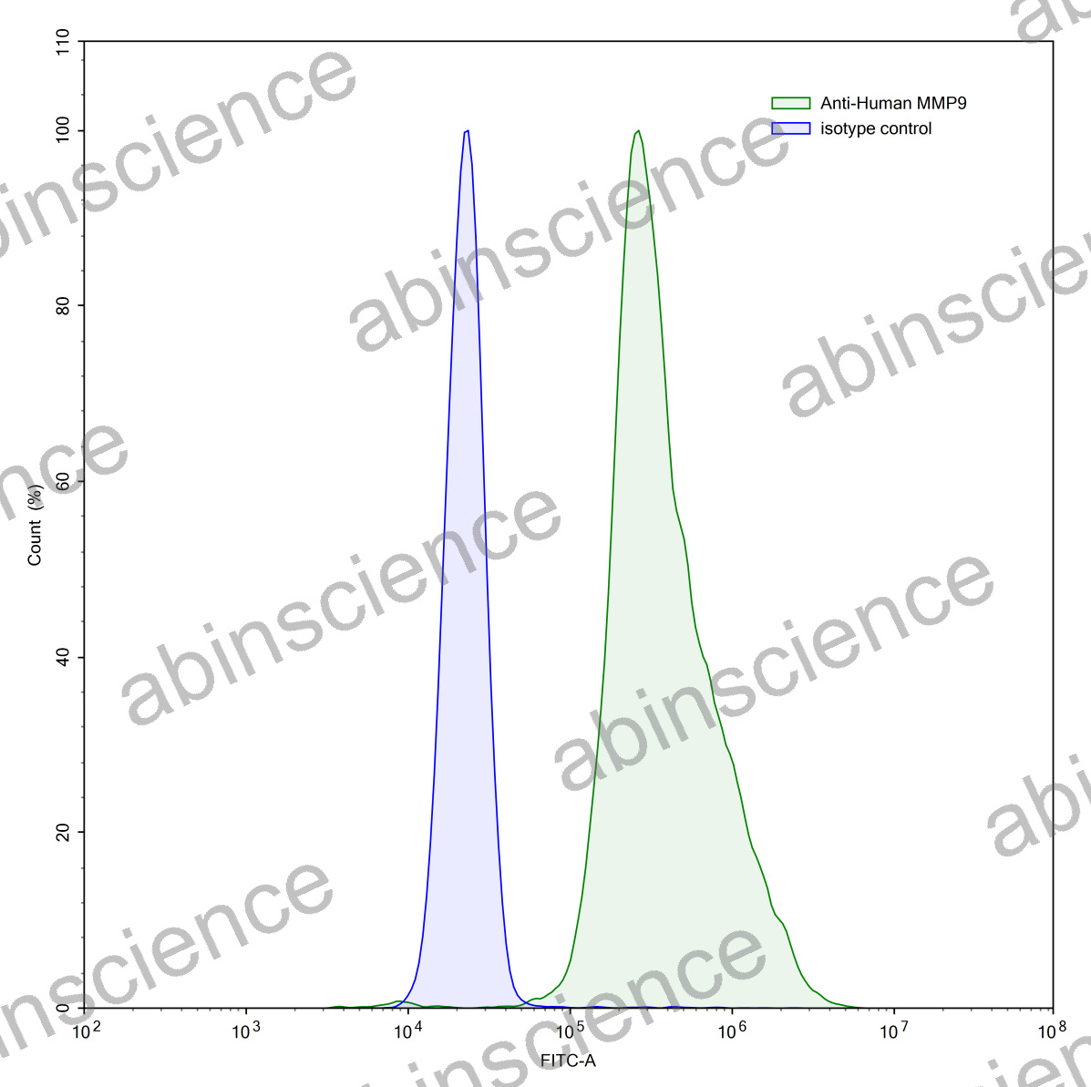 Flow-cytometry using anti-human MMP9 antibody.MMP9 Transfected CHO cells were stained with an irrelevant antibody (Blue Histogram) or an anti-human MMP9 antibody monoclonal antibody (Catalog # HB945107 ,Green Histogram) at a concentration of 5 µg/ml for 30 mins at RT. After washing, bound antibody was detected using a FITC conjugated goat anti-human antibody (Catalog # HF690414) and cells analysed on a NovoCyte Flow Cytometer. |
