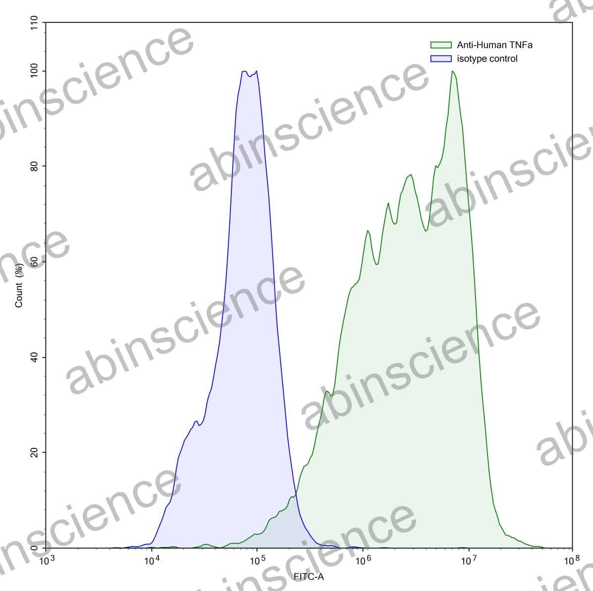 Flow-cytometry using anti-human TNFa antibody.LPS treated THP-1 cells were stained with an irrelevant antibody (Blue Histogram) or an anti-human TNFa antibody monoclonal antibody (Catalog # HF879107 ,Green Histogram) at a concentration of 5 ug/ml for 30 mins at RT. After washing, bound antibody was detected using a FITC conjugated goat anti-mouse antibody (Catalog # MF690414) and cells analysed on a NovoCyte Flow Cytometer.
