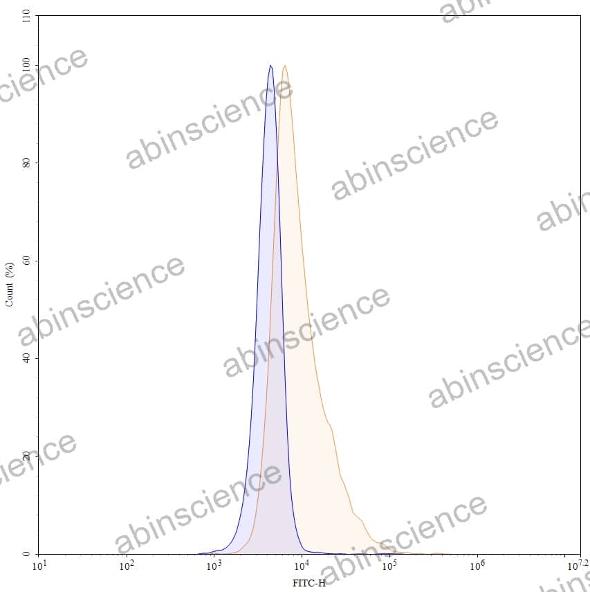 Flow-cytometry using anti-human TNFa antibody. 293T transfected cells were stained with an irrelevant antibody (Blue Histogram) or an anti-human TNFa monoclonal antibody (Catalog: HF879107, Yellow Histogram) at a concentration of 5 µg/ml for 30 mins at RT. After washing, bound antibody was detected using a Goat Anti-Mouse IgG H&L Polyclonal Antibody, FITC (abinScience: MF690414) and cells analysed on a NovoCyte Flow Cytometer.