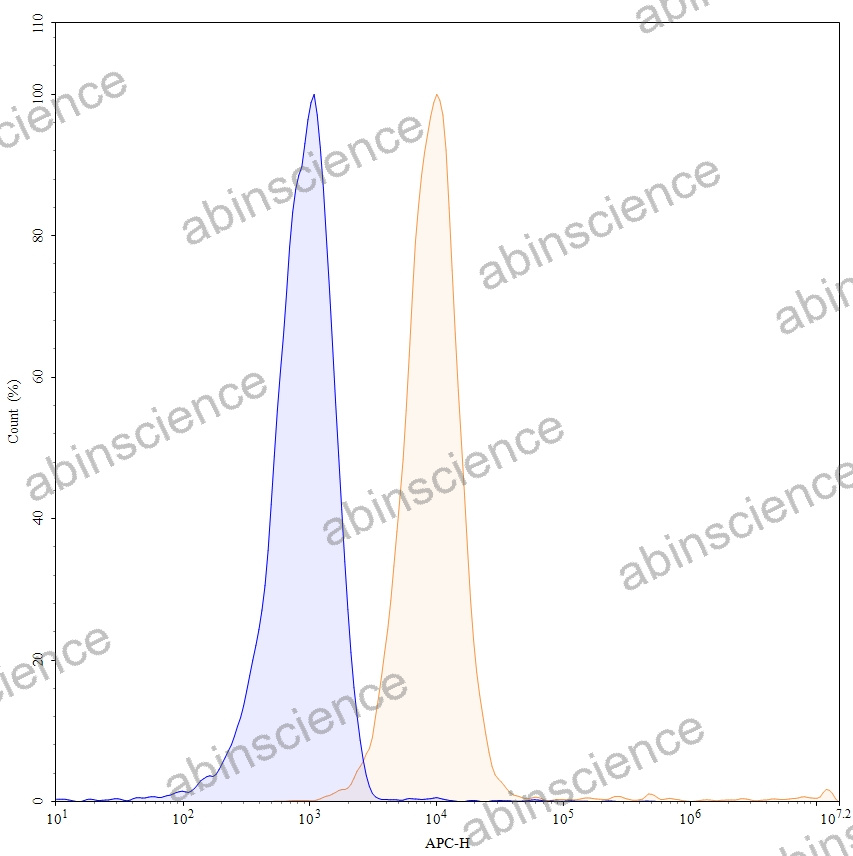 Flow-cytometry using APC anti-human SLC1A5 antibody. Jurkat cells were stained with an irrelevant antibody (Blue Histogram) or an APC anti-human SLC1A5 monoclonal antibody (Catalog: HS734137, Yellow Histogram) at a concentration of 5 µg/ml for 30 mins at RT. After washing, and cells analysed on a NovoCyte Flow Cytometer. |