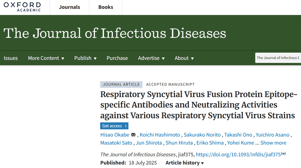 Published in The Journal of Infectious Diseases by the Okabe research team, this study investigates the levels of epitope-specific antibodies (ESA) targeting the major neutralizing epitopes (II, III, IV, V, O sites) of the respiratory syncytial virus (RSV) fusion protein (F protein) in the serum of healthy Japanese adults and their correlation with neutralizing activity (NA). Serum samples from 92 healthy adults (aged 28–75, mean 41.5 years) were analyzed using competitive enzyme-linked immunosorbent assay (ELISA) and neutralization tests to assess ESA and NA levels. Results showed significant differences in ESA levels across epitopes, with lower levels at sites IV and O (2.7 and 10.2 μg/mL) and higher levels at sites II, III, and V (41.9, 16.6, 35.3 μg/mL). NA levels varied with RSV subtype and mutations, with sites V and O showing the strongest correlation with NA. The study highlights that monitoring ESA levels and the evolution of the RSV F protein gene is critical for optimizing vaccines and monoclonal antibody therapies, providing key insights for RSV prevention strategies.