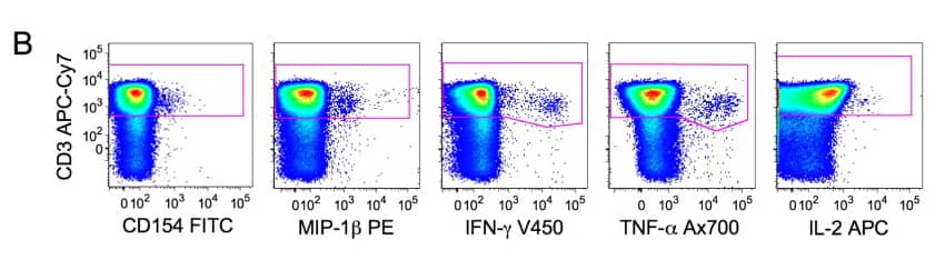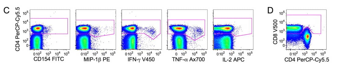 OMIP-016 intentionally incorporates CD154 (CD40L) to identify activated antigen-specific CD4 T cells, and includes MIP-1β to enhance the detection of CD8 responses. The value here does not lie in adding extra markers per se, but in the functional complementarity between them. CD154 reveals activated CD4 subsets that may not secrete classical cytokines yet are antigen-responsive, while MIP-1β strengthens sensitivity relative to traditional IFN-γ and TNF-α readouts. Together, these markers provide a more comprehensive assessment of the breadth of T-cell reactivity.