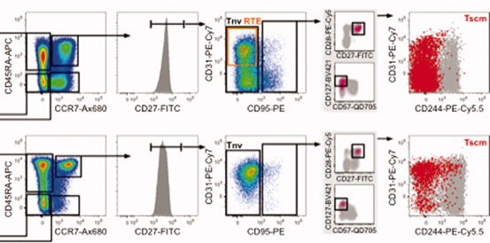 3). Among CD45RA+CCR7+CD27+ cells, use CD95/CD31 to distinguish: Tnv (CD95-), RTE (CD95-CD31+). Within CD95+ cells, gate CD57-CD127+ TSCM; TSCM can also be identified via CD27/CD28 (CD27+CD28+). Finally, overlay the gated TSCM with total CD4+/CD8+ T cells or the CD31+CD45RA+CCR7+ subset to compare CD244 and CD31 expression.