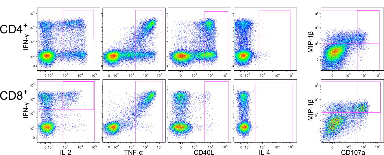 2). Within CD4+ and CD8+ T cells, different functional populations were identified using IFN-γ, IL-2, TNF-α, IL-4, MIP-1β, CD40L (CD154), and CD107a.