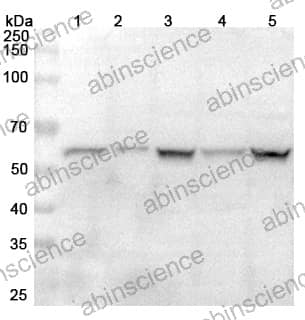 Western blot analysis was performed using anti-HSPA14 polyclonal antibody at 1μg/ml on various samples. Lane 1: SW620 cell lysate Lane 2: Jurkat cell lysate Lane 3: K562 cell lysate Lane 4: HepG2 cell lysate Lane 5: 293T cell lysate