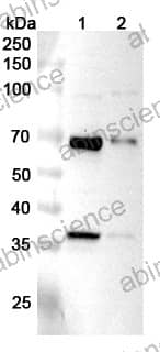 Western blot analysis was performed using anti-LMAN2 polyclonal antibody at 1μg/ml on various samples. Lane 1: Hela cell lysate Lane 2: Jurkat cell lysate