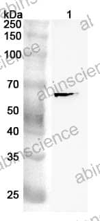 Western blot analysis was performed using anti-SQSTM1 polyclonal antibody at 1ug/mL on various samples. Lane 1: K562 cell lysate