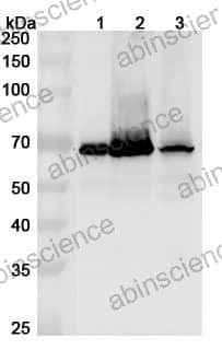 Western blot analysis was performed using anti-HDAC1 polyclonal antibody at 1ug/mL on various samples. Lane 1: K562 cell lysate Lane 2: Jurkat cell lysate Lane 3: HepG2 cell lysate