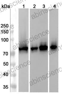 Western blot analysis was performed using anti-CEMP1 polyclonal antibody at 1μg/ml on various samples. Lane 1: Mouse brain lysate Lane 2: Mouse Cerebellum lysate Lane 3: Rat brain lysate Lane 4: Rat Cerebellum lysate