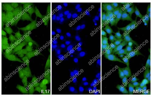 HepG2 cells were fixed with 4% paraformaldehyde for 20 minutes, followed by blocking with 5% goat serum for 1 hour. The cells were then incubated with a primary antibody targeting IL17A (HS856014) at a concentration of 14.6 ug/ml overnight at 4°C. Afterward, the cells were incubated with a secondary antibody, Goat Anti-Rabbit IgG (Alexa Fluor-488) for 50 minutes at room temperature. The localization of IL17A was visualized (shown in green), and nuclear DNA was stained with DAPI (shown in blue). |