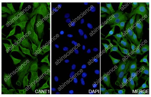 Hela cells were fixed with 4% paraformaldehyde for 20 minutes, followed by blocking with 5% goat serum for 1 hour. The cells were then incubated with a primary antibody targeting CANT1 (HV161014) at a concentration of 26 ug/ml overnight at 4°C. Afterward, the cells were incubated with a secondary antibody, Goat Anti-Rabbit IgG (Alexa Fluor-488) for 50 minutes at room temperature. The localization of CANT1 was visualized (shown in green), and nuclear DNA was stained with DAPI (shown in blue). |