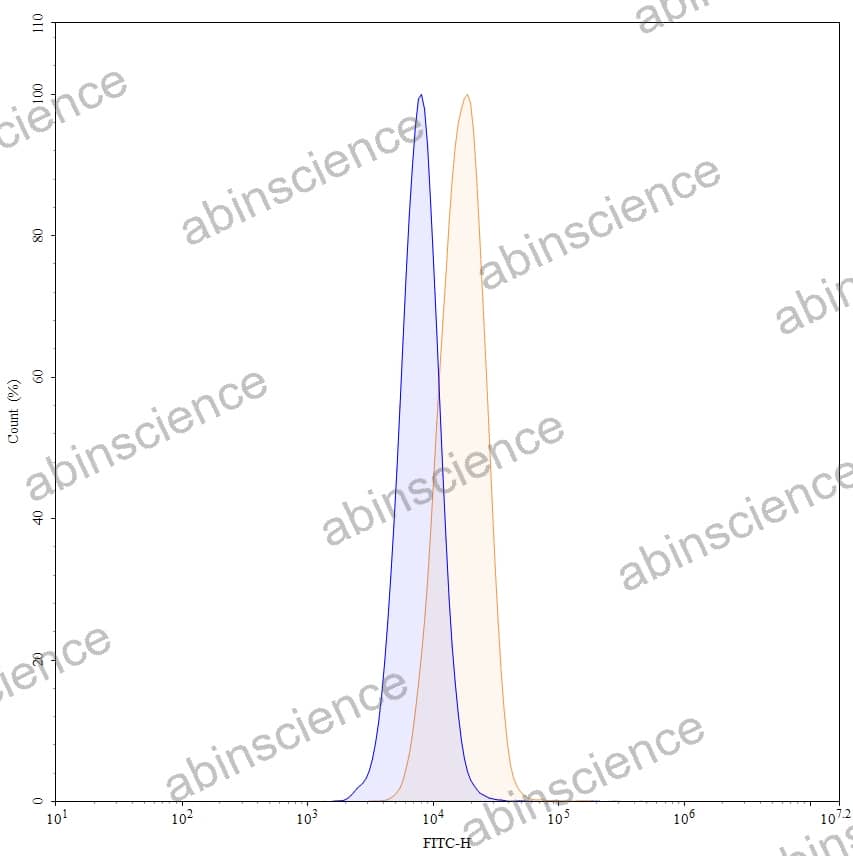 Flow-cytometry using anti-human CD275 antibody. U937 cells were stained with an irrelevant antibody (Blue Histogram) or an anti-human CD275 monoclonal antibody (Catalog: HF564026, Yellow Histogram) at a concentration of 5 µg/ml for 30 mins at RT. After washing, bound antibody was detected using a Goat Anti-Human IgG H&L Polyclonal Antibody, FITC (abinScience: HF690414) and cells analysed on a NovoCyte Flow Cytometer. |