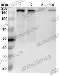Western blot analysis was performed using anti-RAD50 polyclonal antibody at 1ug/mL on various samples.