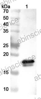 Western blot analysis was performed using anti-ZG16B polyclonal antibody at 1ug/mL on recombinant ZG16B (Catalog No. HV070012).