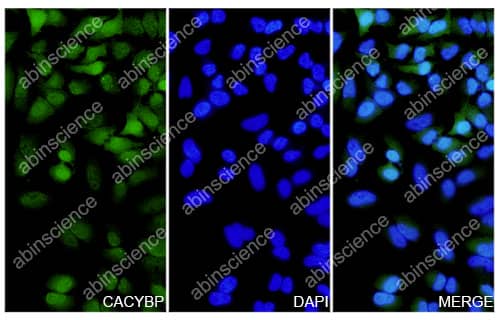 Hela cells were fixed with 4% paraformaldehyde for 20 minutes, followed by blocking with 5% goat serum for 1 hour. The cells were then incubated with a primary antibody targeting CACYBP (HV095014) at a concentration of 14.4 ug/ml overnight at 4°C. Afterward, the cells were incubated with a secondary antibody, Goat Anti-Rabbit IgG (Alexa Fluor-488) for 50 minutes at room temperature. The localization of CACYBP was visualized (shown in green), and nuclear DNA was stained with DAPI (shown in blue). |