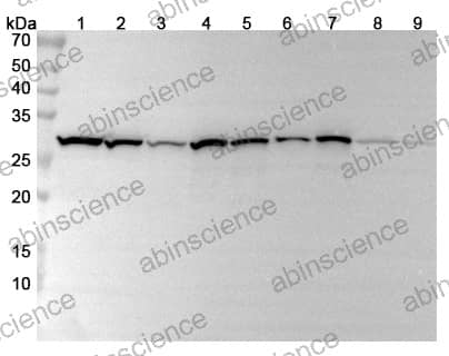 Western blot analysis was performed using anti-CACVBP polyclonal antibody at 1μg/ml on various samples. Lane 1: K562 cell lysate Lane 2: HCT116 cell lysate Lane 3: MCF7 cell lysate Lane 4: 293T cell lysate Lane 5: HepG2 cell lysate Lane 6: HL60 cell lysate Lane 7: Jurkat cell lysate Lane 8: Rat brain lysate Lane 9: Rat liver lysate