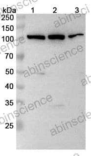 Western blot analysis was performed using anti-ABCB6 polyclonal antibody at 1μg/ml on various samples. Lane 1: Hela cell lysate Lane 2: HepG2 cell lysate Lane 3: HL60 cell lysate