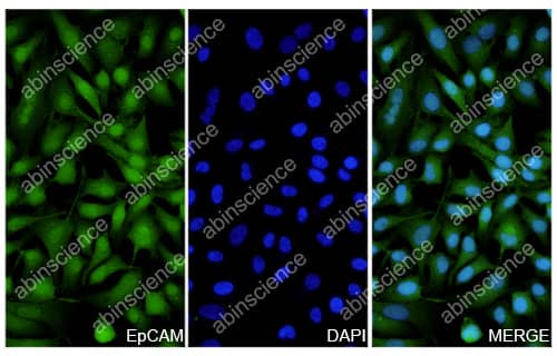 Hela cells were fixed with 4% paraformaldehyde for 20 minutes, followed by blocking with 5% goat serum for 1 hour. The cells were then incubated with a primary antibody targeting EpCAM (HB104014) at a concentration of 20.4 ug/ml overnight at 4°C. Afterward, the cells were incubated with a secondary antibody, Goat Anti-Rabbit IgG (Alexa Fluor-488) for 50 minutes at room temperature. The localization of EpCAM was visualized (shown in green), and nuclear DNA was stained with DAPI (shown in blue).