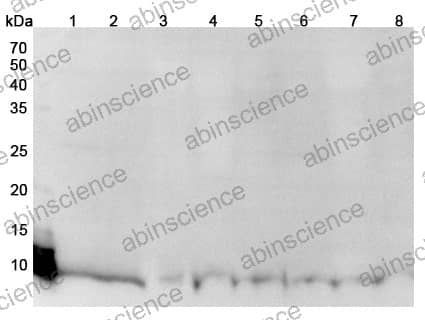 Western blot analysis was performed using anti-S100A12 polyclonal antibody at 1μg/ml on various samples. Lane 1: Human blood lysate Lane 2: Human blood lysate Lane 3: Mouse lung lysate Lane 4: Mouse liver lysate Lane 5: Mouse spleen lysate Lane 6: Rat lung lysate Lane 7: Rat liver lysate Lane 8: Rat spleen lysate