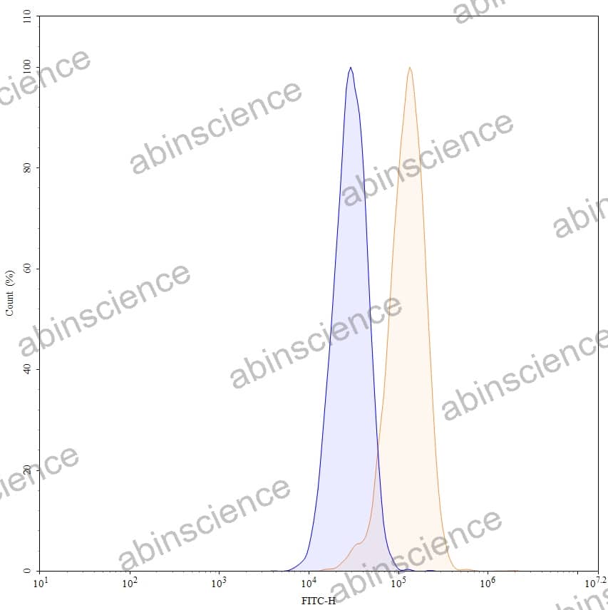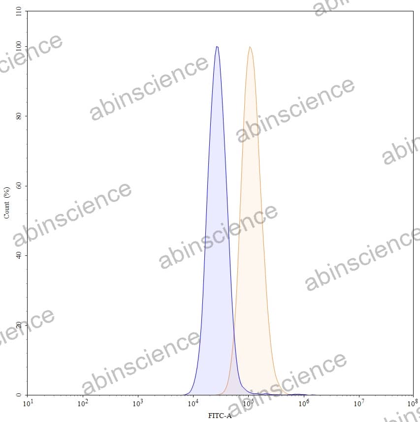 Flow-cytometry using anti-human CD340 antibody. MCF-7 cells were stained with an irrelevant antibody (Blue Histogram) or an anti-human CD340 monoclonal antibody (Catalog HY286036, Yellow Histogram) at a concentration of 5 µg/ml for 30 mins at RT. After washing, bound antibody was detected using a a Goat Anti-Human IgG H&L Polyclonal Antibody, FITC (abinScience: HF690414) and cells analysed on a NovoCyte Flow Cytometer. |