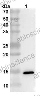 Western blot analysis was performed using anti-A33R polyclonal antibody at 1ug/mL on various samples. Lane 1: recombinant Monkeypox virus/MPXV A33R (Catalog No: VK469012)