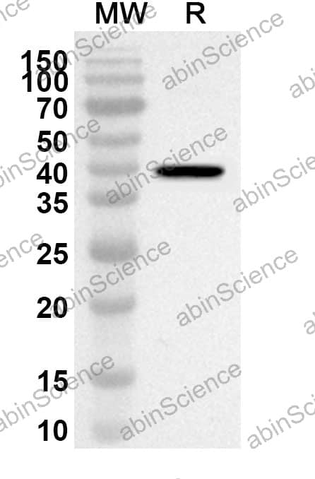 Western blot analysis was performed using anti-Monkeypox virus/MPXV B16R polyclonal antibody at 1ug/mL on recombinant Monkeypox virus/MPXV B16R (Catalog No. VK531012).