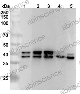 Western blot analysis was performed using anti-TIA1 polyclonal antibody at 1μg/ml on various samples. Lane 1: Hela cell lysate Lane 2: 293T cell lysate Lane 3: K562 cell lysate Lane 4: Mouse brain lysate Lane 5: Rat brain lysate