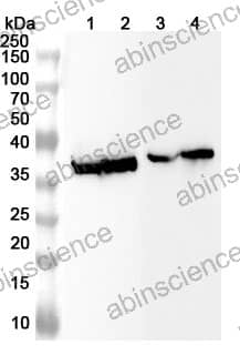 Western blot analysis was performed using anti-P2RX4 polyclonal antibody at 1ug/mL on various samples. Lane 1: Mouse liver lysate Lane 2: Mouse kidney lysate Lane 3: Rat liver lysate Lane 4: Rat kidney lysate