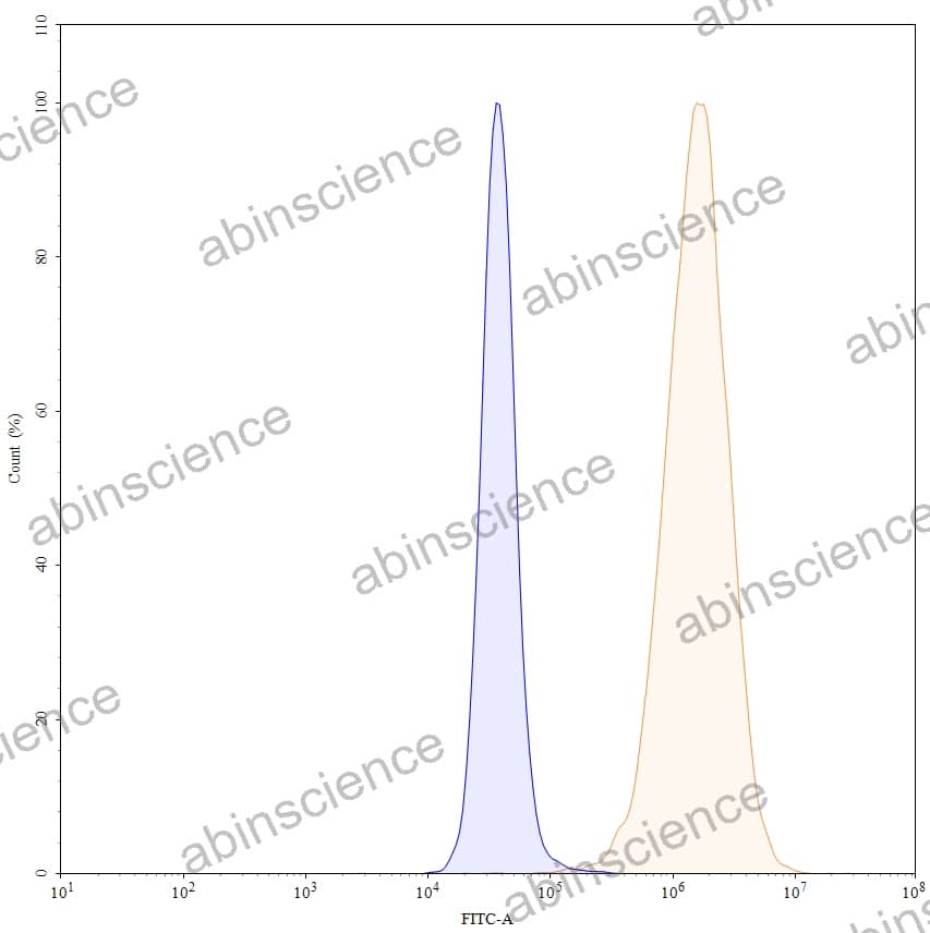 Flow-cytometry using anti-human EGFR antibody. A431 cells were stained with an irrelevant antibody (Blue Histogram) or an anti-human EGFR monoclonal antibody (Catalog HF004126, Yellow Histogram) at a concentration of 5 µg/ml for 30 mins at RT. After washing, bound antibody was detected using a a Goat Anti-Human IgG H&L Polyclonal Antibody, FITC (abinScience: HF690414) and cells analysed on a NovoCyte Flow Cytometer. |