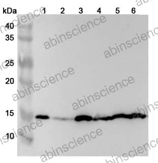Western blot analysis was performed using anti-HINT1 polyclonal antibody at 1ug/mL on various samples. Lane 1: Raji cell lysate Lane 2: K562 cell lysate Lane 3: Jurkat cell lysate Lane 4: Hela cell lysate Lane 5: HepG2 cell lysate Lane 6: MCF-7 cell lysate