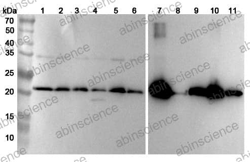Western blot analysis was performed using anti-UQCRFS1 polyclonal antibody at 1μg/ml on various samples. Lane 1: MCF7 cell lysate Lane 2: A2780s cell lysate Lane 3: Raji cell lysate Lane 4: A549 cell lysate Lane 5: MCF7 cell lysate Lane 6: 293T cell lysate Lane 7: Mouse heart lysate Lane 8: Mouse skeletal muscle lysate Lane 9: Rat brain lysate Lane 10: Rat heart lysate Lane11: Rat skeletal muscle lysate