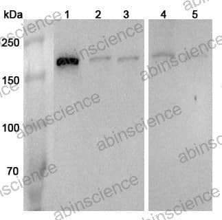 Western blot analysis was performed using anti-RPTOR polyclonal antibody at 1μg/ml on various samples. Lane 1: NIH3T3 cell lysate Lane 2: Hela cell lysate Lane 3: 293T cell lysate Lane 4: PC12 cell lysate