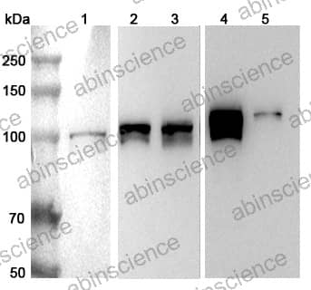 Western blot analysis was performed using anti-RBM15 polyclonal antibody at 1μg/ml on various samples. Lane 1: NIH3T3 cell lysate Lane 2: K562 cell lysate Lane 3: Hela cell lysate Lane 4: 293T cell lysate Lane 5: Jurkat cell lysate