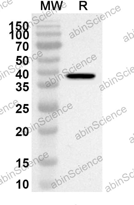 Western blot analysis was performed using anti-Human PPP2CA polyclonal antibody at 1ug/mL on recombinant Human PPP2CA (Catalog No. HX136012). |