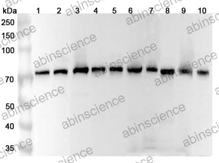 Western blot analysis was performed using anti-Mortalin polyclonal antibody at 1μg/ml on various samples. Lane 1: Hela cell lysate Lane 2: K562 cell lysate Lane 3: A549 cell lysate Lane 4: MCF-7 cell lysate Lane 5: HepG2 cell lysate Lane 6: Mouse liver lysate Lane 7: Mouse brain lysate Lane 8: Mouse kidney lysate Lane 9: Rat liver lysate Lane 10: Rat brain lysate