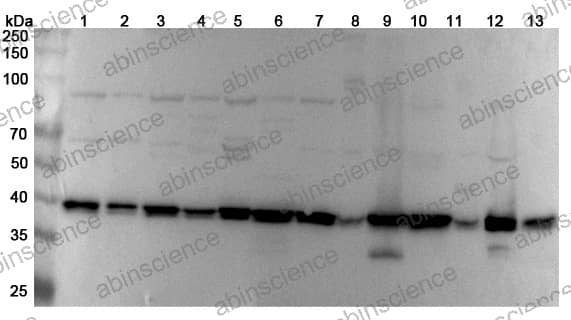 Western blot analysis was performed using anti-DNAJB11 polyclonal antibody at 1μg/ml on various samples. Lane 1: Raji cell lysate Lane 2: Hela cell lysate Lane 3: HepG2 cell lysate Lane 4: A549 cell lysate Lane 5: 293T cell lysate Lane 6: MCF7 cell lysate Lane 7: NIH3T3 cell lysate Lane 8: Mouse heart lysate Lane 9: Mouse liver lysate Lane 10: Mouse lung lysate Lane11: Rat heart lysate Lane12: Rat liver lysate Lane13: Rat lung lysate