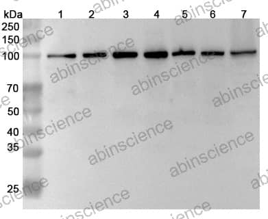 Western blot analysis was performed using anti-MCM6 polyclonal antibody at 1μg/ml on various samples. Lane 1: HL60 cell lysate Lane 2: Hela cell lysate Lane 3: Jurkat cell lysate Lane 4: HepG2 cell lysate Lane 5: PC12 cell lysate Lane 6: NIH3T3 cell lysate Lane 7: Mouse spleen lysate