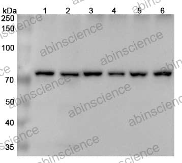 Western blot analysis was performed using anti-XRCC6 polyclonal antibody at 1μg/ml on various samples. Lane 1: Hela cell lysate Lane 2: Lncap cell lysate Lane 3: HepG2 cell lysate Lane 4: Jurkat cell lysate Lane 5: K562 cell lysate Lane 6: 293T cell lysate
