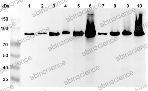 Western blot analysis was performed using anti-ACO2 polyclonal antibody at 1μg/ml on various samples. Lane 1: Neuro-2a cell lysate Lane 2: Jurkat cell lysate Lane 3: Mouse brain lysate Lane 4: Mouse kidney lysate Lane 5: Mouse heart lysate Lane 6: Rat brain lysate Lane 7: Rat kidney lysate Lane 8: Rat heart lysate