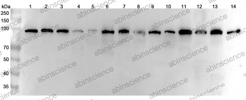 Western blot analysis was performed using anti-ACTN2 polyclonal antibody at 1μg/ml on various samples.