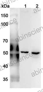 Western blot analysis was performed using anti-ANXA7 polyclonal antibody at 1μg/ml on various samples. Lane 1: Mouse brain lysate Lane 2: Rat brain lysate